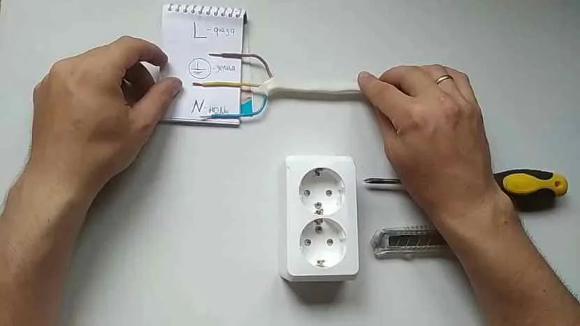 - Присоединение второй розетки во время параллельного проведения проводов в соответствии с цветами.