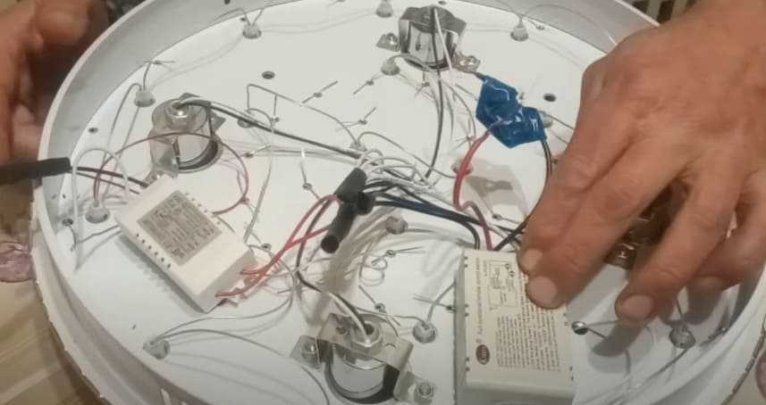 Такой блок устанавливается при наличии в осветительном приборе светодиодной группы ламп и подключается к одному из выводов контроллера при помощи драйвера. Если люстра китайская, в ней может быть установлен драйвер с непонятными характеристиками, которые не были указаны на корпусе. Обычно его подсоединение выполнено двумя входящими красными проводами (фаза и ноль), а также есть два выходных провода – черный присоединяется к «+» светодиодов, а белый на «-». Светодиоды в люстре подключаются последовательно, и при поломке одного из них перестанет функционировать вся цепочка.