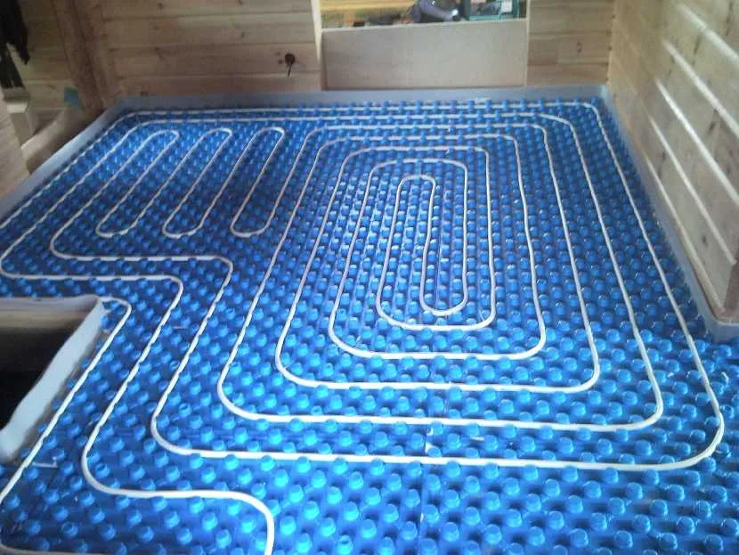 Посмотрим, как происходит процесс обустройства водяного пола с использованием пенополистирольных плит, но при условии заливки стяжки поверх них. Плиты будут использоваться вместо арматурной сетки для фиксации труб теплого пола на поверхности основания.