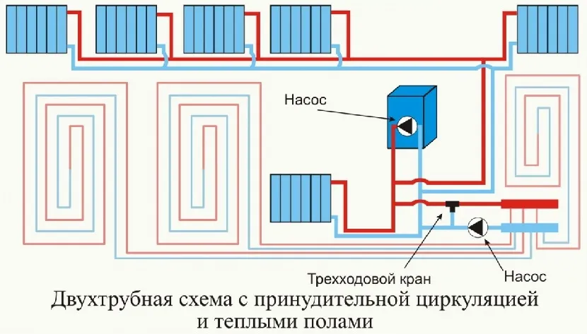 2-трубная схема позволяет подключать несколько независимых контуров для подогрева полаИсточник akvahit.ru