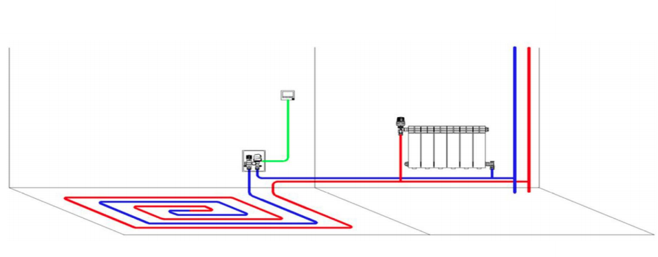 Соединять таким способом отдельные контуры в полах, например, с переходом из одной комнаты в другую, неэффективно. Так как теплоноситель будет уже существенно охлажден. Единственно правильный вариант для такой схемы – это подключение единственной ветки для обогрева пола от радиаторной обратки.