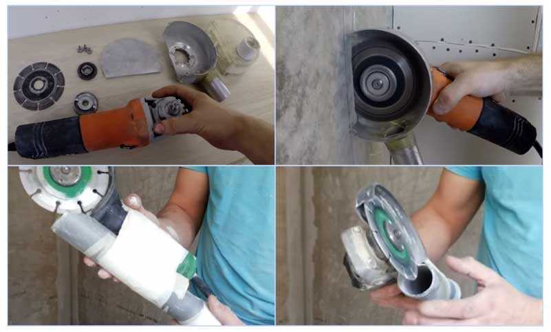 Есть и более простой способ борьбы с пылью — к ручке углошлифовальной машинки малярной лентой привязывают отрезок водопроводной трубы и подключают к ней пылесос. Основными инструментами для штробление стен под трубы своими руками являются перфоратор и болгарка, более дорогой штроборез используется при проведении профессиональных работ в строительной отрасли. Своими руками можно превратить болгарку в аналог штробореза, проведя довольно простые изменения в конструкции.