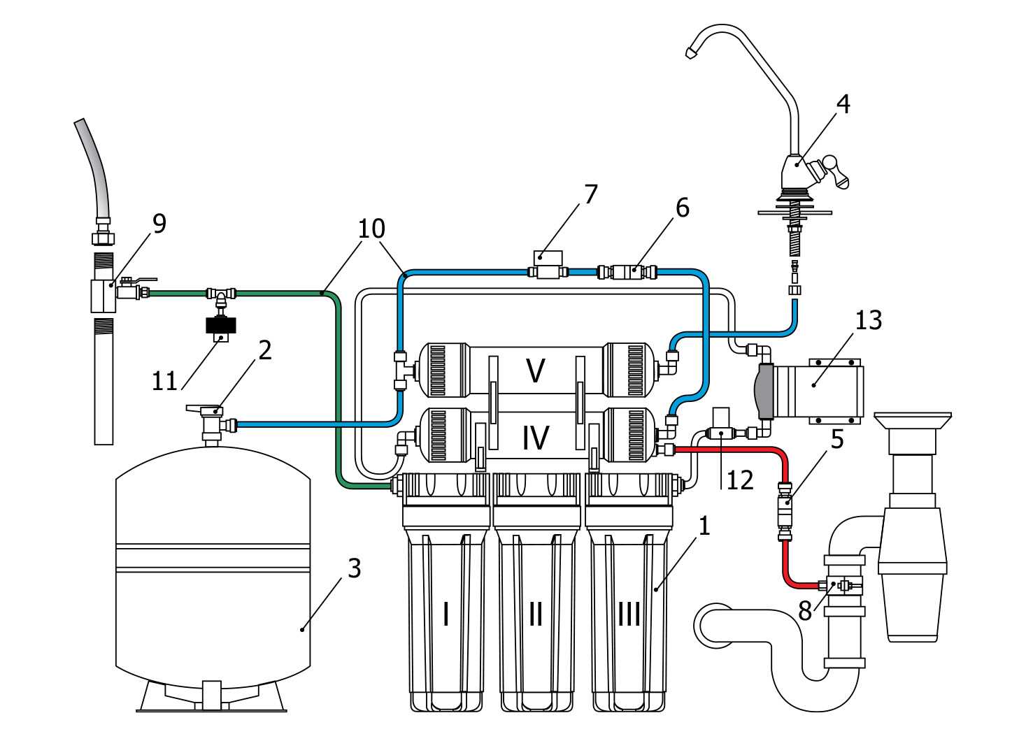 Пример одной из возможных схем. Насос может размещаться в разрыв поводящей трубки перед первым префильтром, а также после второго или третьего