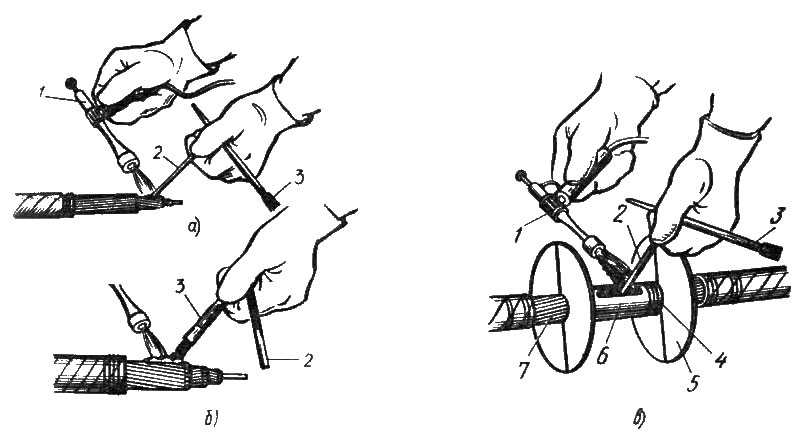 1 — горелка; 2 — припой; 3 — стальная кисточка; 4 — асбестовая пряжа; 5 — тепловой экран; 6 — форма: 7 — жила кабеля.