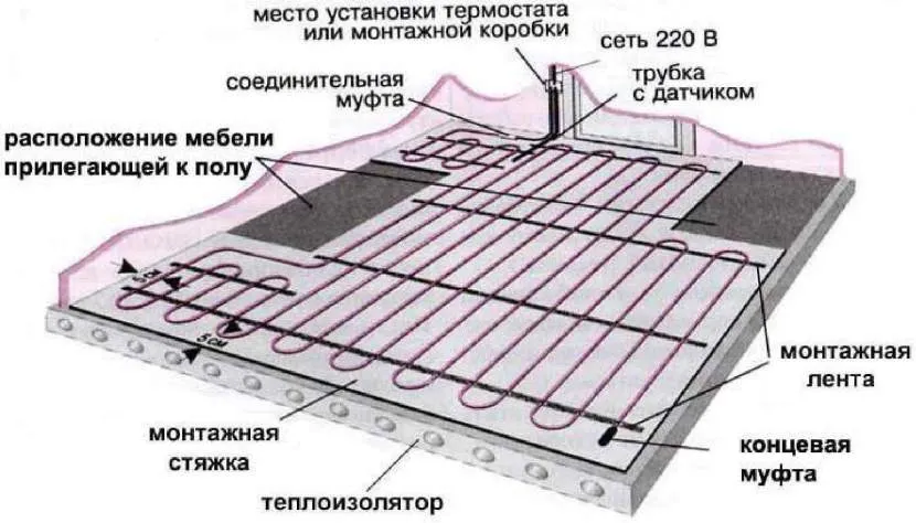 Условная схема электрического пола с необогреваемыми участками под мебельюИсточник rulandia.ru