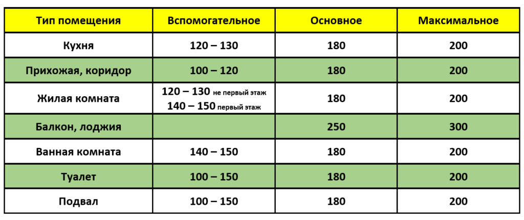 — 200 Вт/м2, если дополнительный — от 100 до 160. При этом расчётное