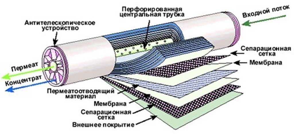 В установке обратного осмоса для очистки применяются полимерные полупроницаемые мембраны, через которые под давлением проходят молекулы воды. Этот процесс очистки воды от загрязнений и примесей убирает до 99% веществ.