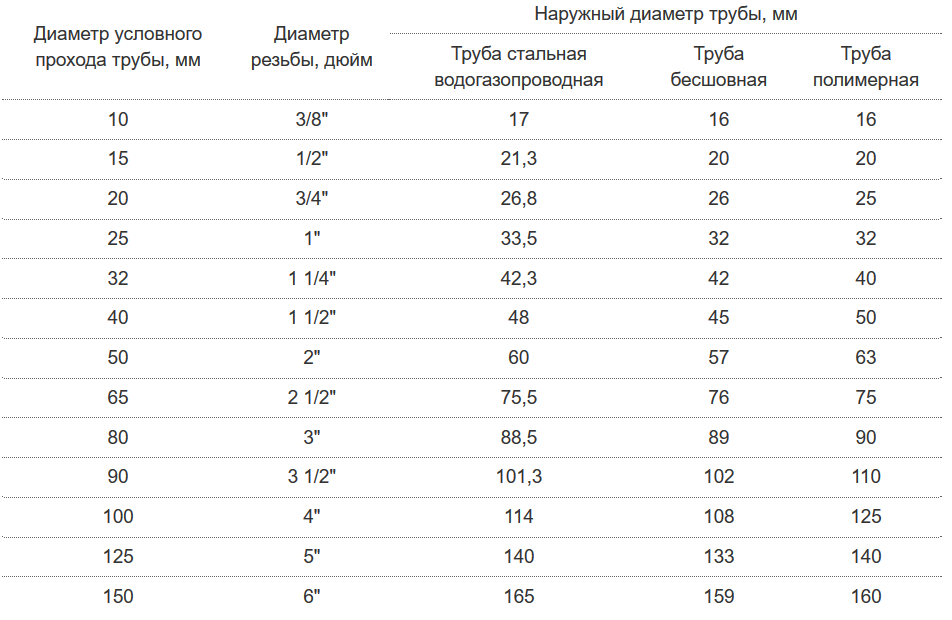 Соответствие диаметров труб различных видов в обеих единицах измерения можно найти в соответствующей таблице.
