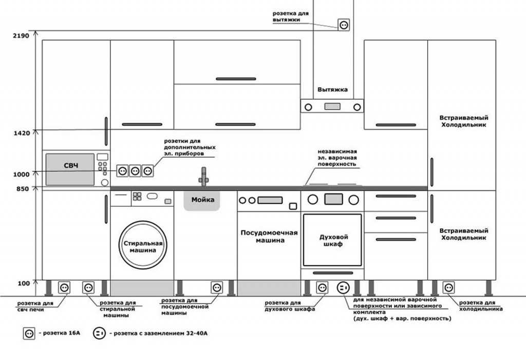 Если рядом находится духовой шкаф, то розетка должна быть ниже духовки. Чаще всего ее размещают возле кухонных ножек (не ниже 10 см от пола). Но совсем на полу розетку делать тоже нельзя, так как существует вероятность подтопления соседями или протечки водопровода.