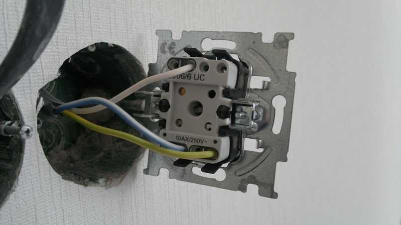 Если на розетке есть скоба или заземляющий контакт, их необходимо подключить. Для этого используется желто-зеленая жила кабеля, которая соединяется с нужным разъемом. Следует понимать, что заземление необходимо только для розетки. Коммутатор этого не требует.