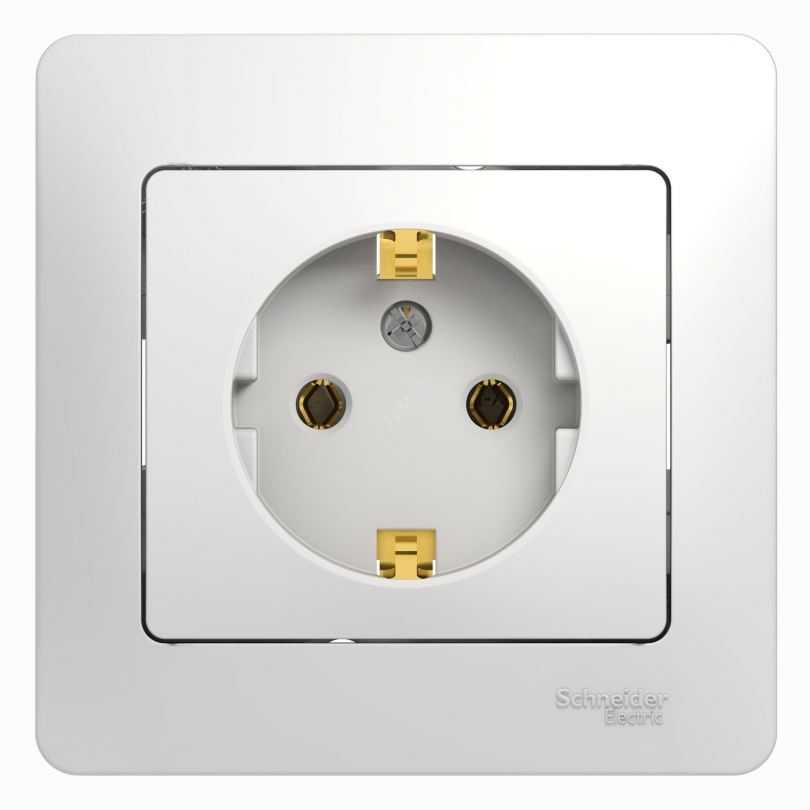 Внешний вид электрической розетки по стандартам, установленным странами Евросоюза. Отличительная особенность конструкции – присутствие контактных биметаллических пластин заземления