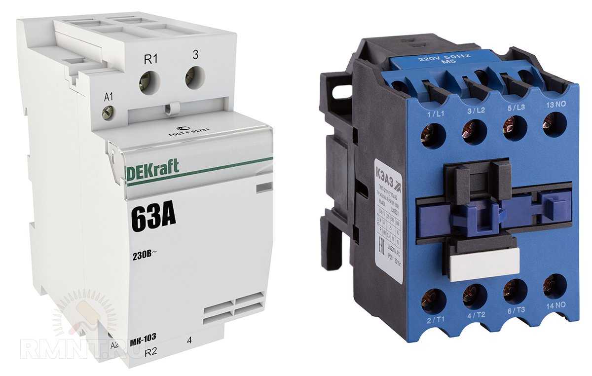 Слева: модульный контактор на DIN-рейку 63 А. Справа: контактор панельного монтажа