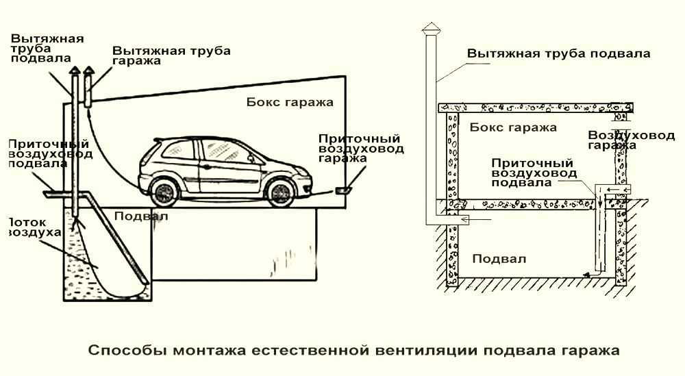 Для устройства системы воздухообмена гаража с подвалом следует организовать следующее: