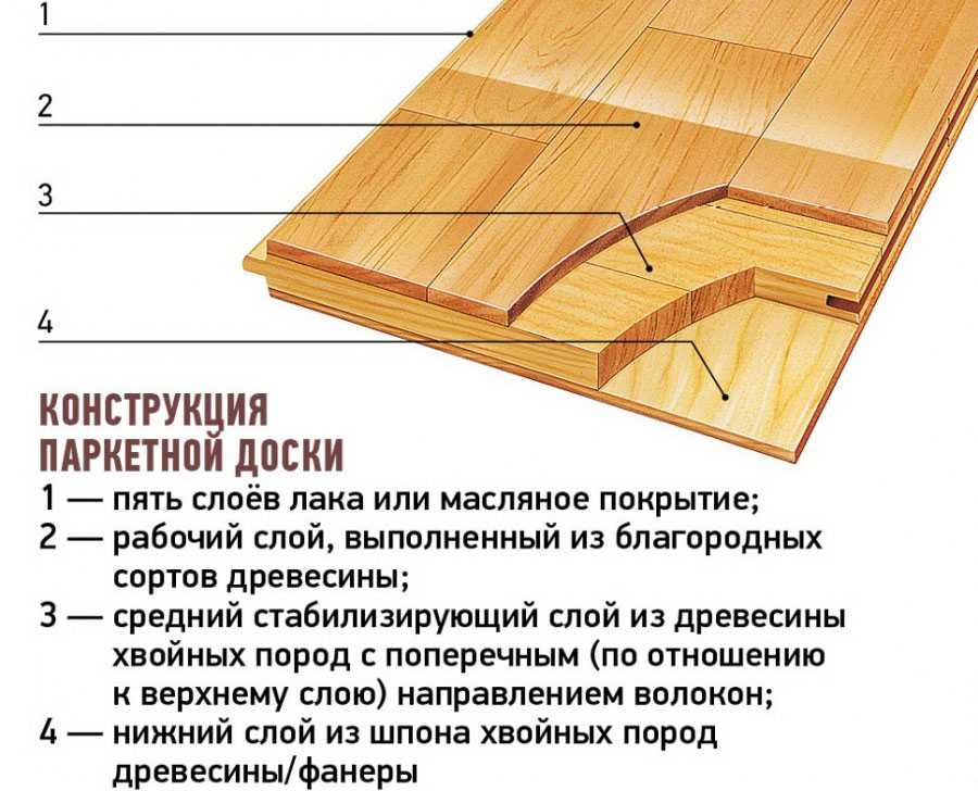 Паркетная доска меньше подвержена температурно-влажностным деформациям за счёт того, что представляет собой многослойную конструкцию, где слои расположены взаимно перпендикулярно