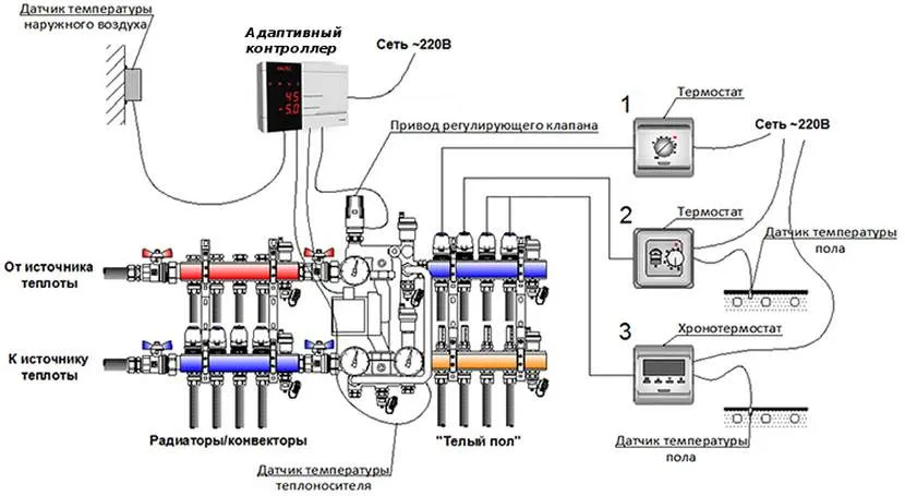 Схема управления двухконтурным теплым полом с помощью электронного термостата
