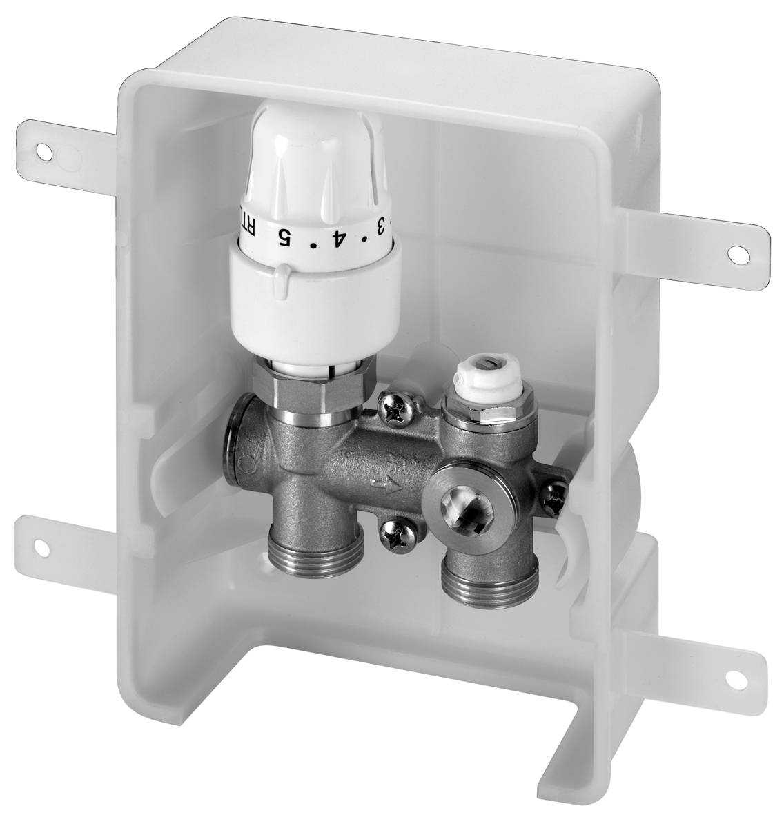 - Смесители термостатические бывают не только трехходовые, но и двухходовые. Такой клапан можно установить вместо одного из ручных вентилей (способ регулировки при помощи вентиля, описанный выше), и он уже будет поддерживать заданную температуру автоматически.