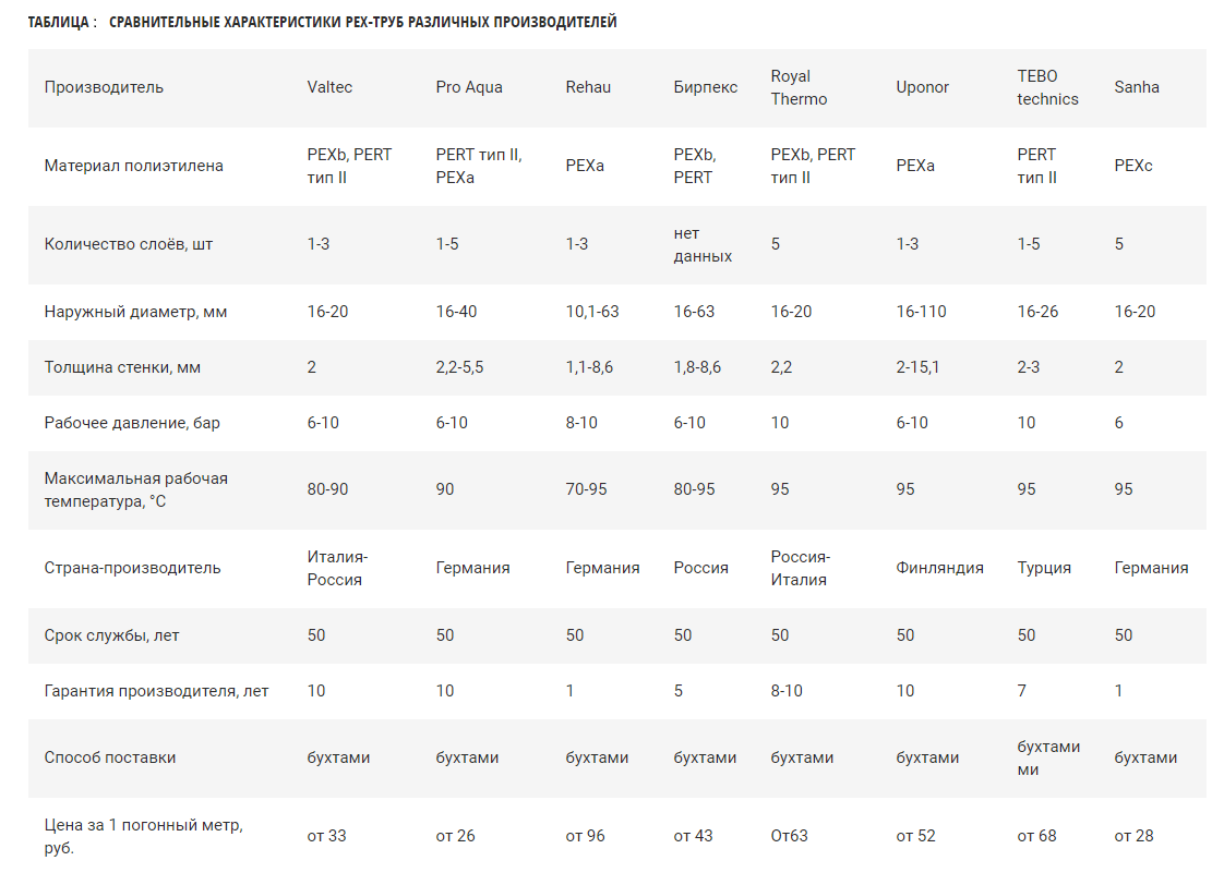 Сравнить технические характеристики РЕХ-полиэтилена с прочими полимерными материалами, используемыми для изготовления водопроводных труб, возможно при помощи нижеприведённой таблице.