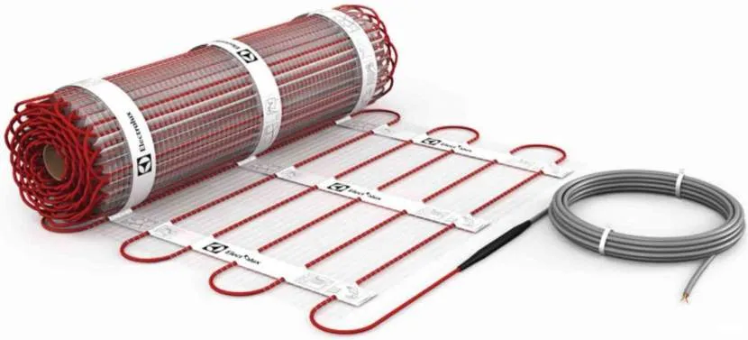 Греющий кабель для системы напольного отопления продается на бабине, в виде отдельных секций или специальных матов (рулонов). Маты состоят из теплопроводника, который уложен змейкой и укреплен на основе из стекловолоконной сетки. Такой материал можно легко разрезать на фрагменты, разумеется, не нарушая целостность электрокабеля, и покрыть им плоскости любого размера и формы.