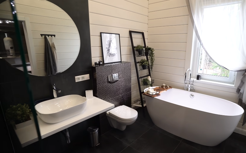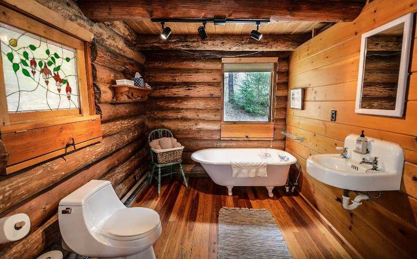 В уборной и тем более ванной необходимо брать прочную влагостойкую древесину – тик, лиственницу, термодоску или инженерную доску. Вместо плитки также можно взять водоустойчивые версии ламината или паркета.