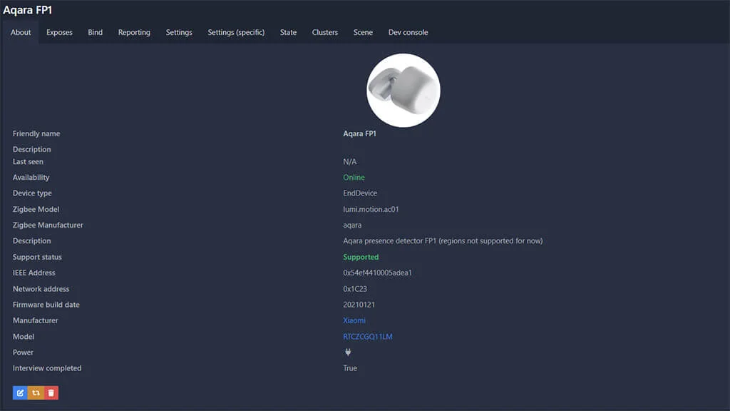 The Aqara FP1 Human Presence Sensor is compatible with all three major Home Assistant Integrations: ZHA, ZigBee2MQTT and Deconz. However, to utilize each quirk this sensor has to offer, we suggest using ZigBee2MQTT. It supports OTA updates, and most of the available settings the sensor publishes are available. Regions are currently NOT supported in any integration, but they are most likely to come to ZigBee2MQTT first.