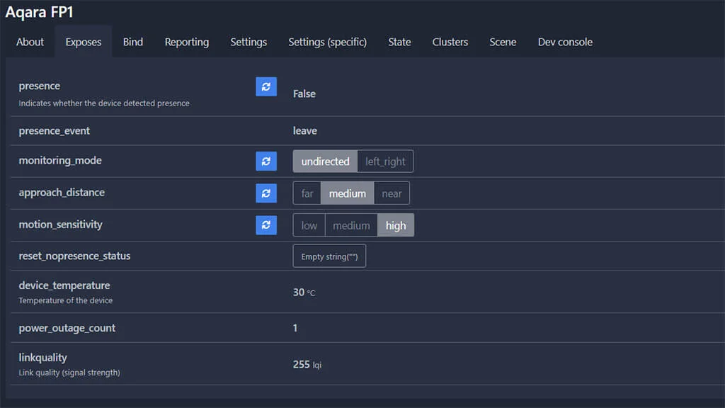 To pair the FP1 to your coordinator, press and hold the button under the magnetic base for ~5 seconds until the blue LED starts blinking. The device enters pairing mode and will join your network. If you are having issues, try short-pressing the button while it’s being added.When added to ZHA, the FP1 exposes the following entities to Home Assistant: