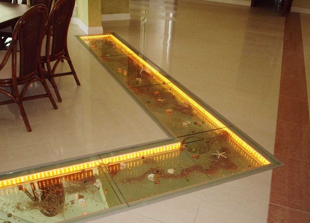 - Возможно покрытие стеклом большого пространства. Такой пол непременно должен иметь установленную подсветку. Благодаря свойствам светопрозрачности материала, получается неповторимое, уникальное оформление помещения.