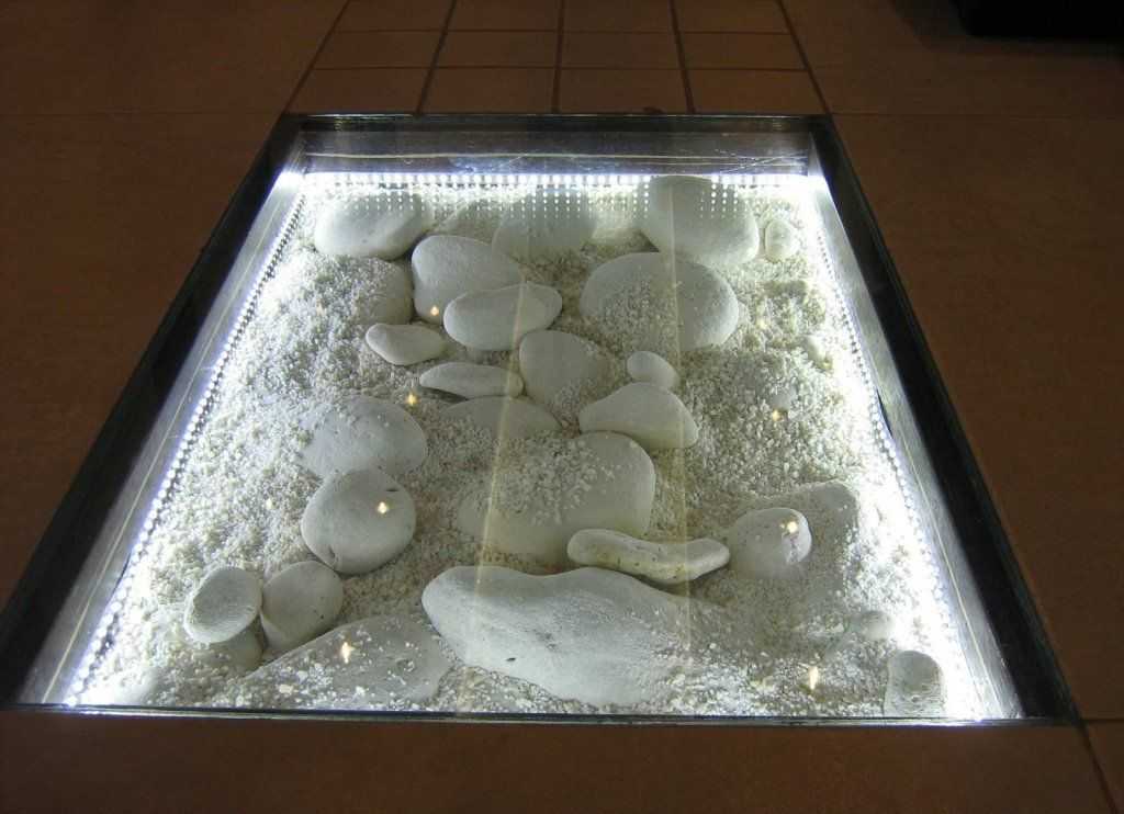 - стеклянные ниши. Данная конструкция представляет собой углубление в полу определенной формы, которое заполняют декором и покрывают стеклом. Стеклянный люк в полу придает оригинальности любой комнате и позволяет создать внутри него флористическую композицию из лепестков роз, высушенных растений или настоящую выставку минералов, монет или сувениров;