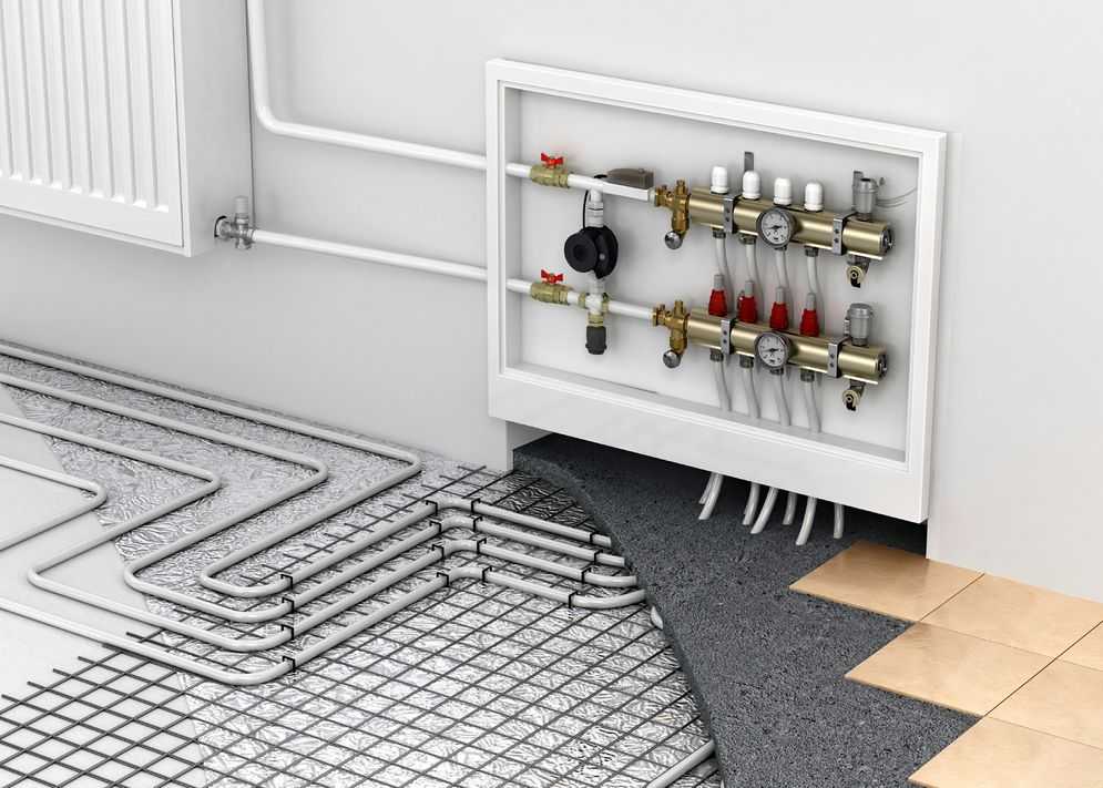 Когда водяное отопление в доме уже есть, задача заключается в том, чтобы встроить теплый пол в уже существующую систему. Если устройство системы начинается с нуля, необходим монтаж теплового узла водяного теплого пола.