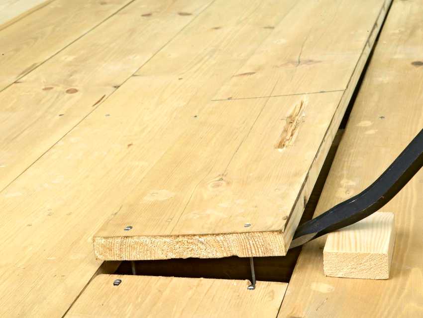Чтобы аккуратно вскрыть деревянный пол, первую доску приподнимают на 1-1,5 см гвоздодёром или ломом, просунув его в щель между стеной и полом. Начинают с середины, постепенно переходя к краям. Приподнятую деталь снова вколачивают к лагам, чтобы обнажить шляпки гвоздей. Гвоздодёром вынимают крепежи, вытаскивают доску из соединения шип-паз, стараясь не повредить место горизонтального соединения. Так же поступают с другими деталями.
