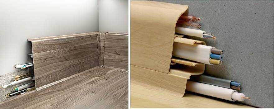 Особенности некоторых конструкций не дают возможности разместить внутри плинтуса нужное количество проводов.