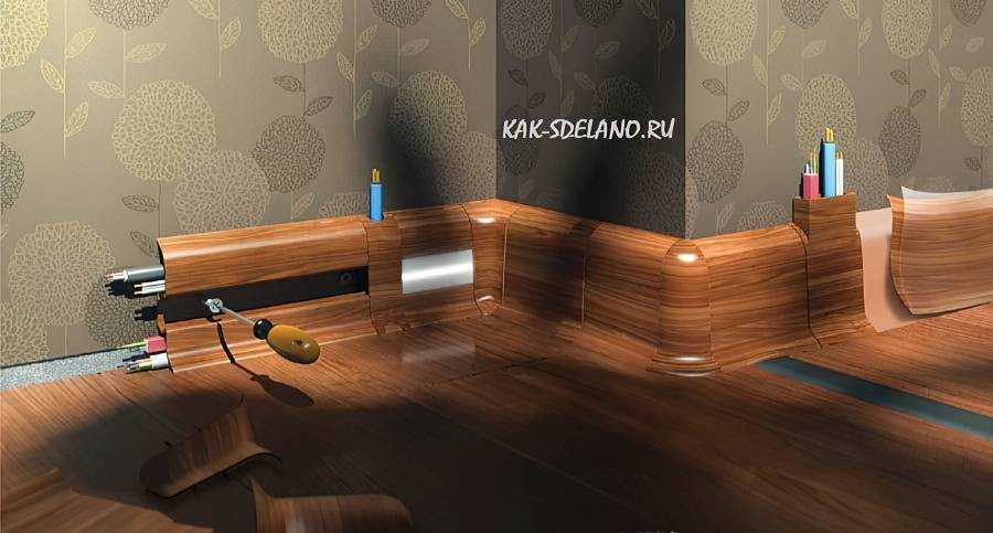 Используя напольный плинтус ПВХ с кабель каналом можно скрытно развести провода/кабели