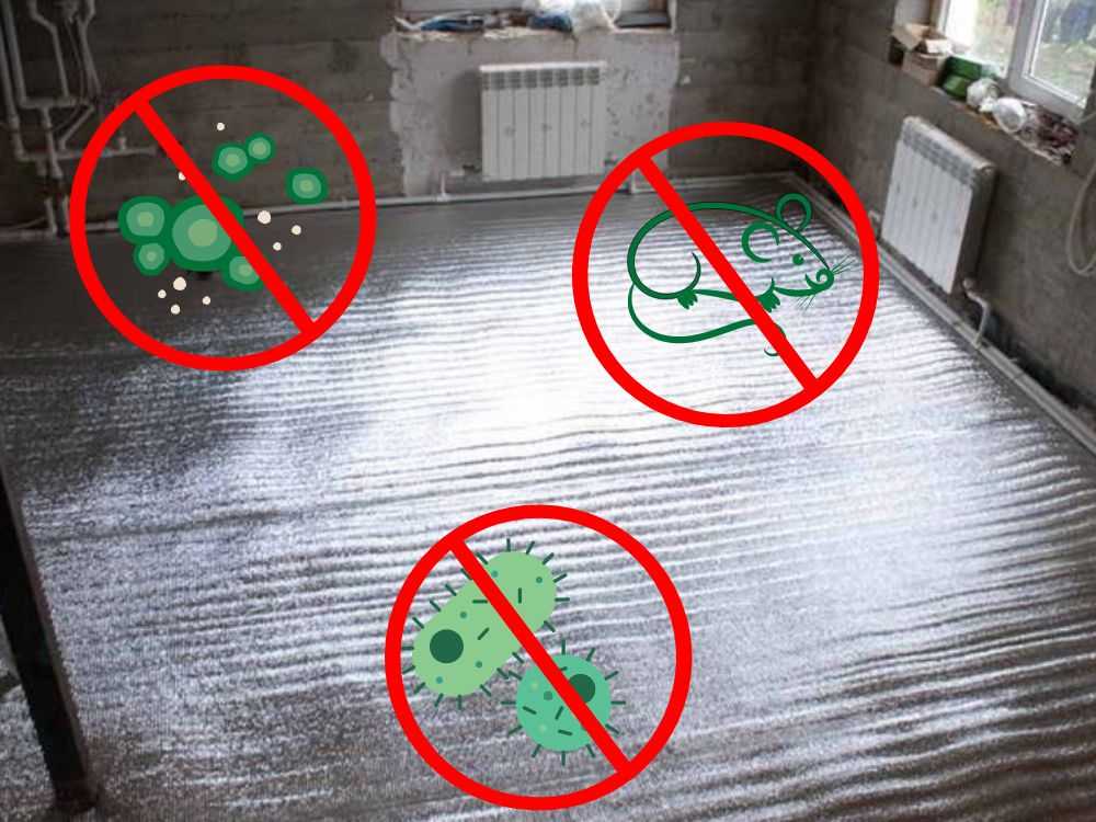 Плотное прилегание исключает образование комфортной для бактерий среды. Плесень и различные виды грибка не смогут выжить. Также плотная структура спасает от мышей, крыс и других нежелательных в доме животных. В пространствах, для которых характерна повышенная влажность, утеплитель укладывают за гидроизоляционные свойства.
