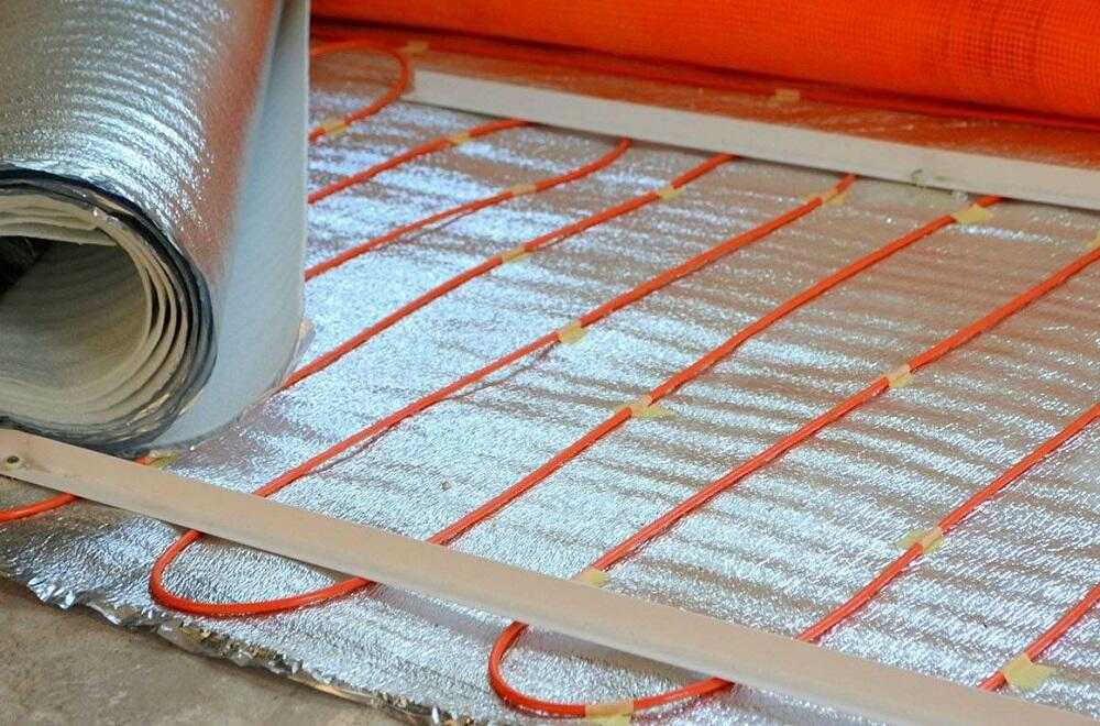 Если в помещении предусмотрен электрический или водяной «теплый» пол, рулоны раскатывают отражающей стороной вверх, сверху укладывают армирующую сетку, затем нагревательные элементы и производят цементную стяжку с последующей облицовкой.