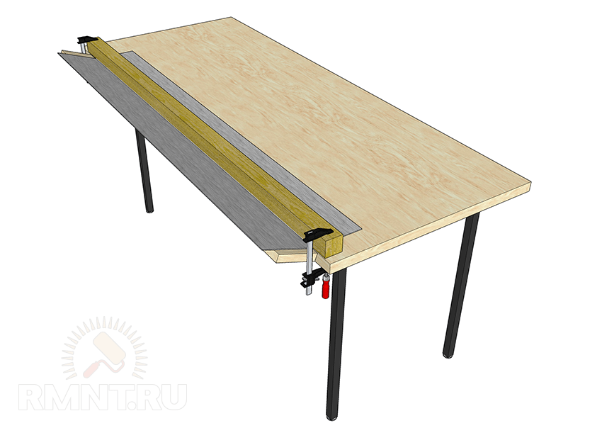 Ширина полок конька — от 15 до 30 см, соответственно, понадобится полоса вдвое большей ширины с припуском по 10 мм с каждой стороны. Этот край может иметь неровности с допуском 2–3 мм, так что ровный раскрой не нужен. Нанесите разметку из трёх продольных линий: центр конька и оба его края. Уложите полосу центром на край стола и прижмите бруском под двумя струбцинами по линии разметки.