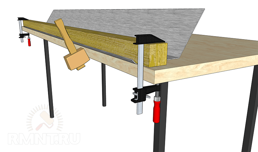 Лист жести размещается на краю стола со смещением на нужную длину, затем ударами резинового молотка аккуратно загибается его край. В конце работы он должен плотно соприкасаться с нижней плоскостью уголка.