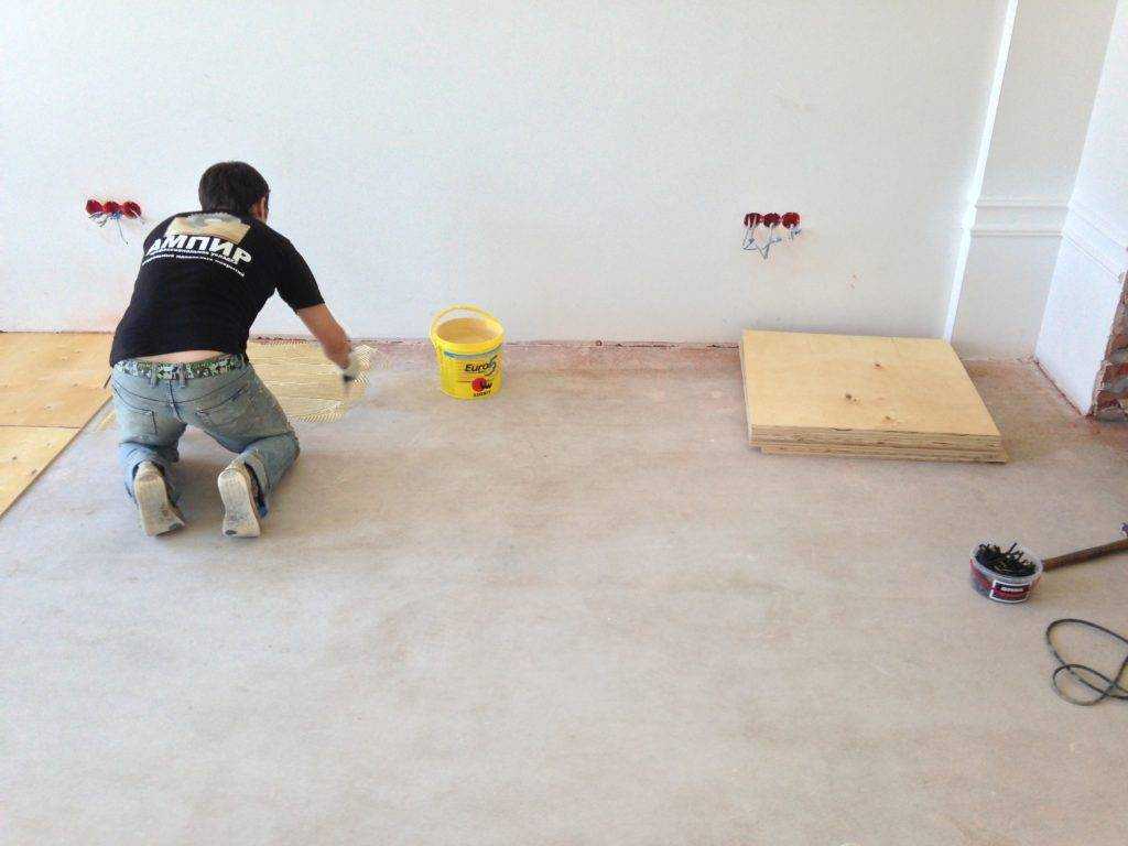 Выравнивание пола фанерой выполняют следующим образом: