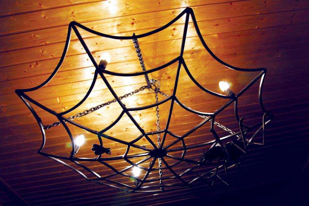 На деревянном потолке будет гармонично смотреться кованная люстра-паутинка