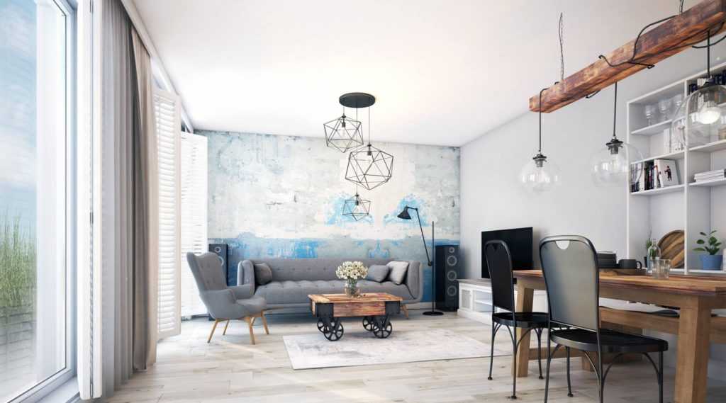 Оригинальное расположение уместно в совмещенном помещении — в кухне с гостиной или гостиной-столовой. В частном доме нередко под гостевую комнату отводится просторный холл. В этом случае допускается наличие не одной, а нескольких люстр, каждая из которых размещается над отчетливо сгенерированной функциональной зоной. Вместо бра и торшеров — люстры разного размера, перекликающиеся в материале и форме для соблюдения общего стиля.