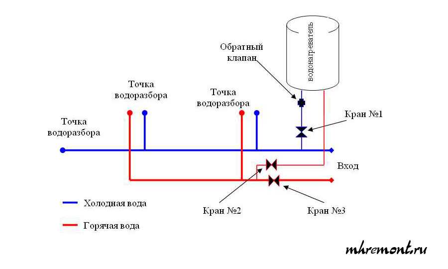 Типовая схема изображена на рисунке ниже. Если смотреть на изображение слева направо, то первая точка водоразбора будет унитаз, вторая мойка, третья ванна, также в этой схеме предусмотрен водонагреватель. Подающая магистраль (стояки горячей и холодной воды) расположены справа.