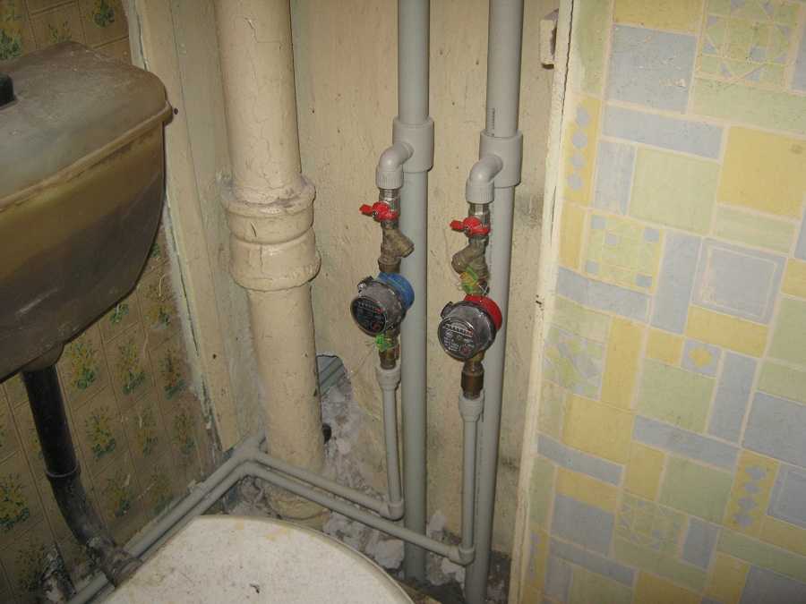 Сборку водопровода начинают от стояков. Первое что делают это устанавливают счетчики. Для этого сначала к запорному крану, установленному на отвод от стояка, монтируют фильтр-грязевик (механический фильтр грубой очистки), после чего устанавливают счётчик воды. Далее вся система будет изготавливаться из ПП труб. Для соединения с счетчиком используется не разъемное резьбовое соединение.