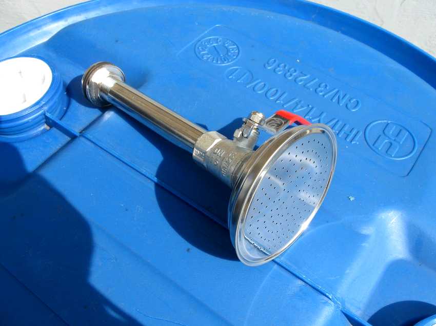 Лейка для летнего душа монтируется в днище емкости, где вода подается в систему под собственным давлением