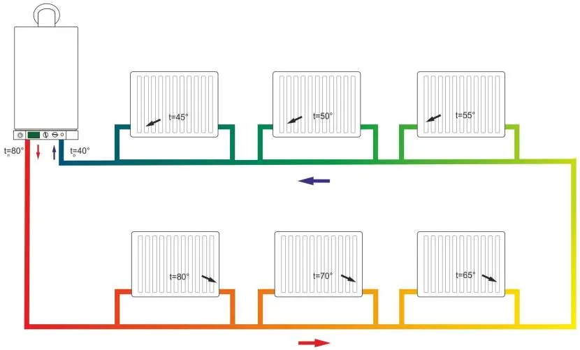 Такая схема отопления состоит из одной главной трубы, которая, выходя из котла (из подачи), проходит через всю систему и превращается из горячей трубы в холодную, и входит снова в котел (в обратку).