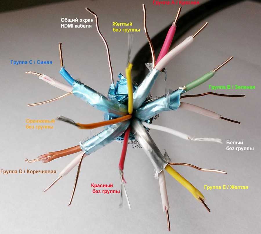Как правило, «плюсовой» провод каждой группы окрашен в белый цвет, в то время как «минус» — в цвет, соответствующий группе. Это сделано для того, чтобы распайка HDMI проходила проще и быстрее, а шанс совершить ошибку был ниже.