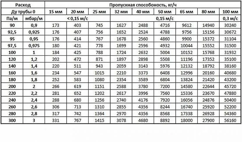 Таблица пропускной способности труб для жидкостей, газа, водяного пара.