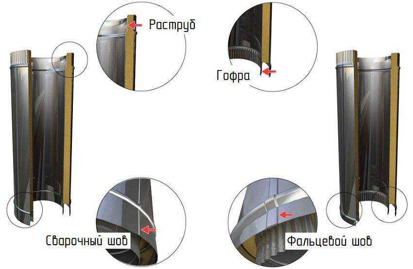 Обратите внимание, что внешние трубы выполняются из нержавеющих сортов стали, а внутренние из оцинкованных. Это необходимо для того, чтобы защитить внешнюю поверхность от воздействия погодных условий, а внутреннюю от агрессивной среды, создаваемой дымовыми газами.