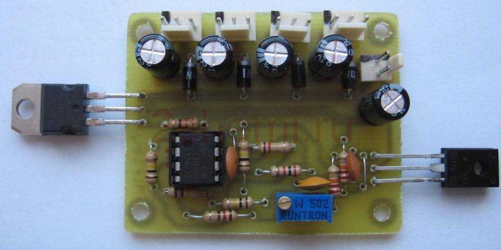 Следует иметь в виду, что транзистор Т2 работает линейно, поэтому выделяется большая мощность потерь, которая непосредственно переводится в тепло. Плата спроектирована так, чтобы можно было ее прикрутить к радиатору. Транзисторы T1 и T2 необходимо смонтировать на длинных выводах и их отогнуть, чтобы можно было установить на радиатор. Не забудьте прокладки, чтоб изолировать их электрически от радиатора.