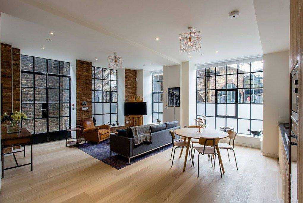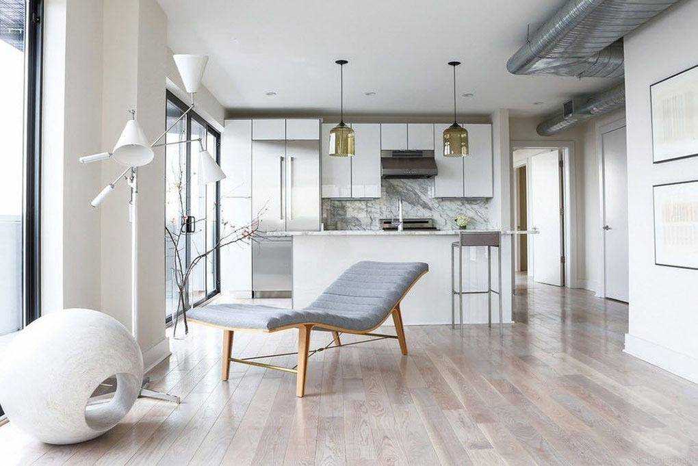 Немного небрежный стиль, в котором нет места лишней мебели. Для того, чтобы добавить помещению уюта, можно сделать темный пол из ламината, грубоватой паркетной доски и даже глянцевой плитки. Некоторые владельцы предпочитают оставить бетонное покрытие, при этом возникает ощущение незаконченной стяжки. Такой пол потребует дополнительного утепления.