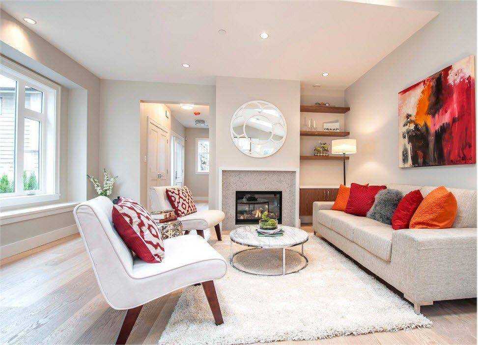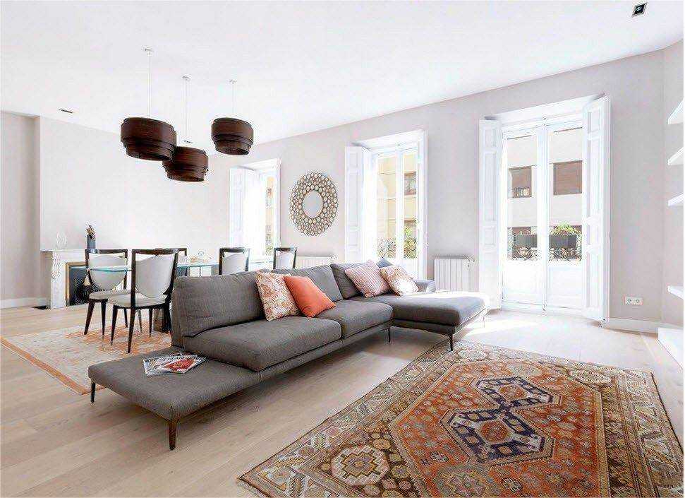 Лучше всего, чтобы мебель была на пару тонов светлее или темнее поверхности пола. Если же цвета пола и мебели точно совпали, то их желательно разделить контрастного цвета ковром – именно так часто оформляется светлая гостиная с тёмным полом.