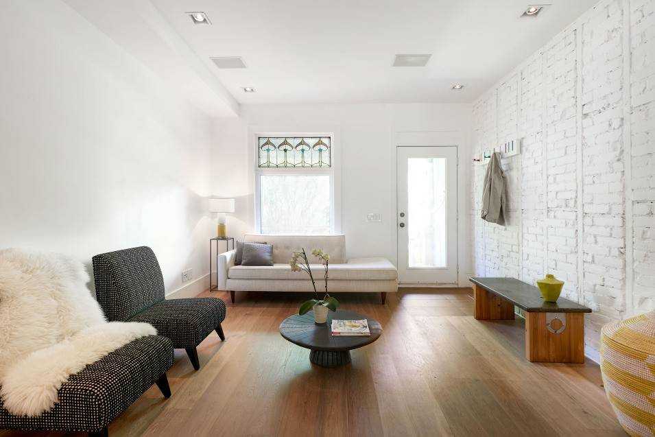 С полами из светлого дерева прекрасно гармонирует чёрная или тёмно-коричневая мебель. Поскольку светлые тона на самом деле способны сделать тёмное помещение более светлым, то этот приём очень часто используется для комнат с недостаточным естественным освещением. Однако здесь нужно учитывать и другой эффект – чем помещение светлее, тем оно кажется прохладнее, поэтому нужно найти правильный баланс, например, используя сочетание тёмного пола и светлых дверей.
