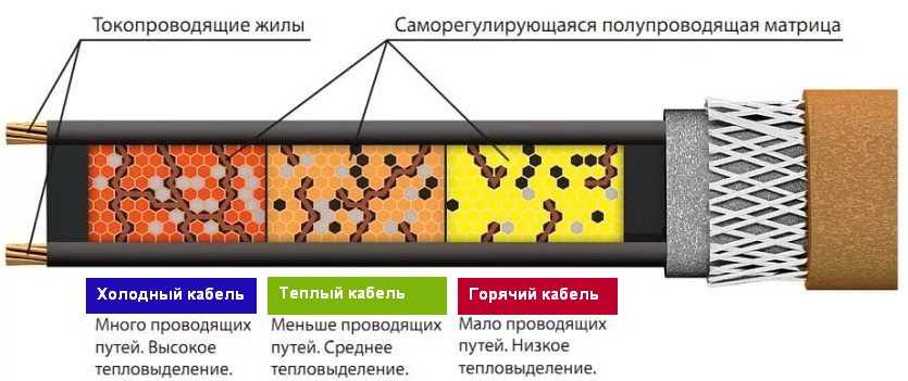 Саморегулирующийся кабель. Нагревательный элемент данного типа кабеля расположен между токопроводящими жилами по всей длине. В основе нагревательного вещества лежит полупроводник с положительным температурным коэффициентом (PTC). Чем сильнее прогревается кабель и окружающее его пространство, тем меньше тепла он выделяет. Тем самым провод сильнее «жарит» холодный пол и «еле греет» уже прогретый. Отличительной чертой данного типа является наличие моделей, мощностью до 60+ ватт на погонный метр. Мощность является начальной, когда пол холодный, при нагревании мощность падает.